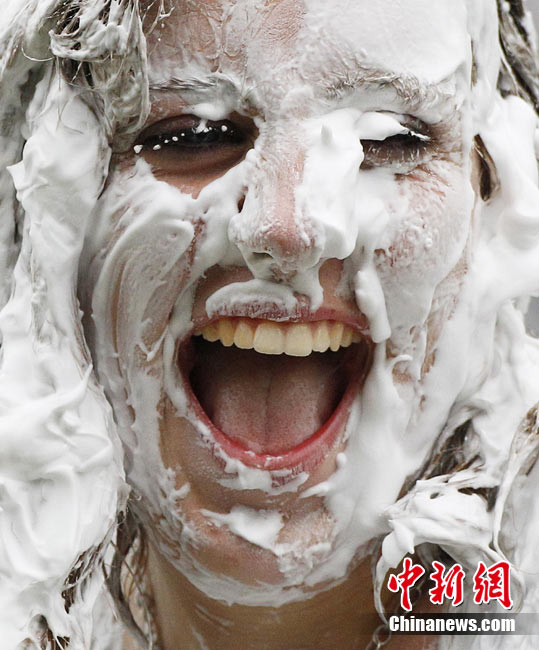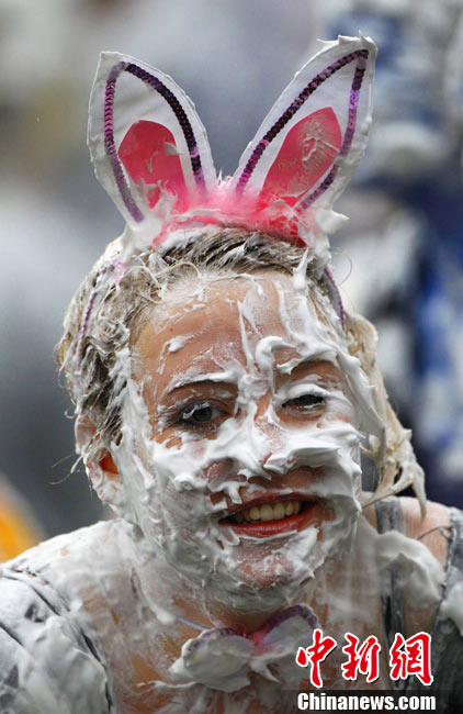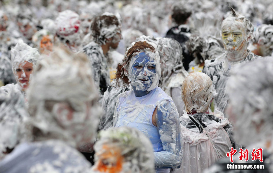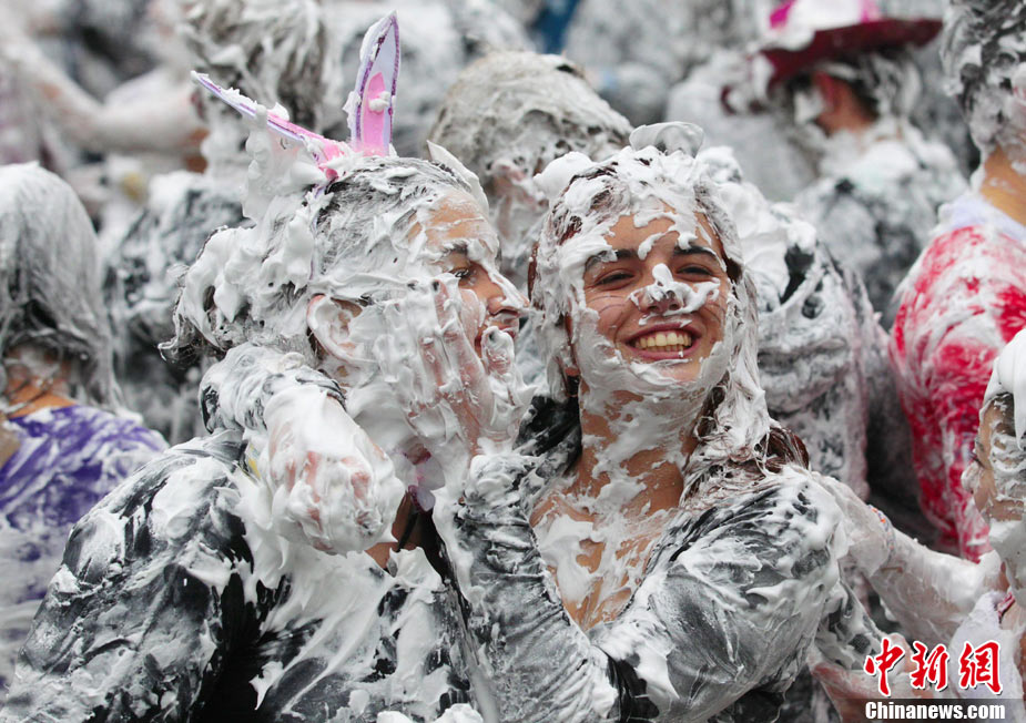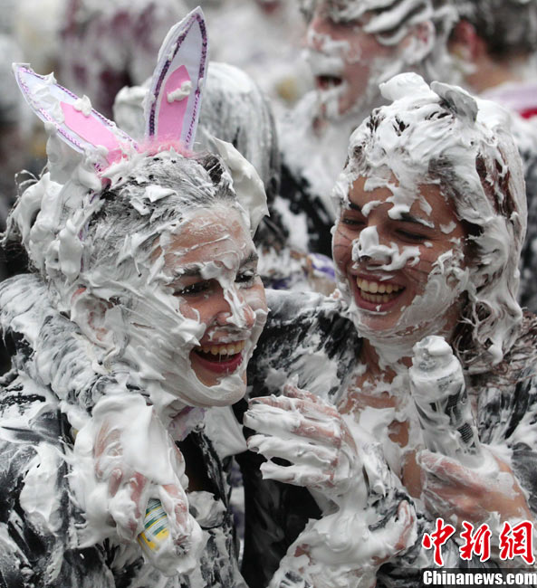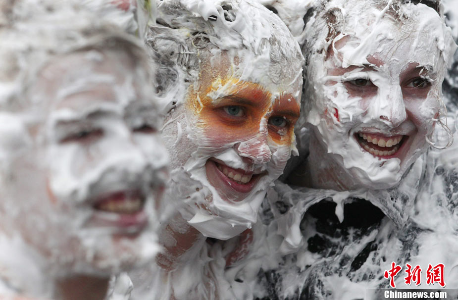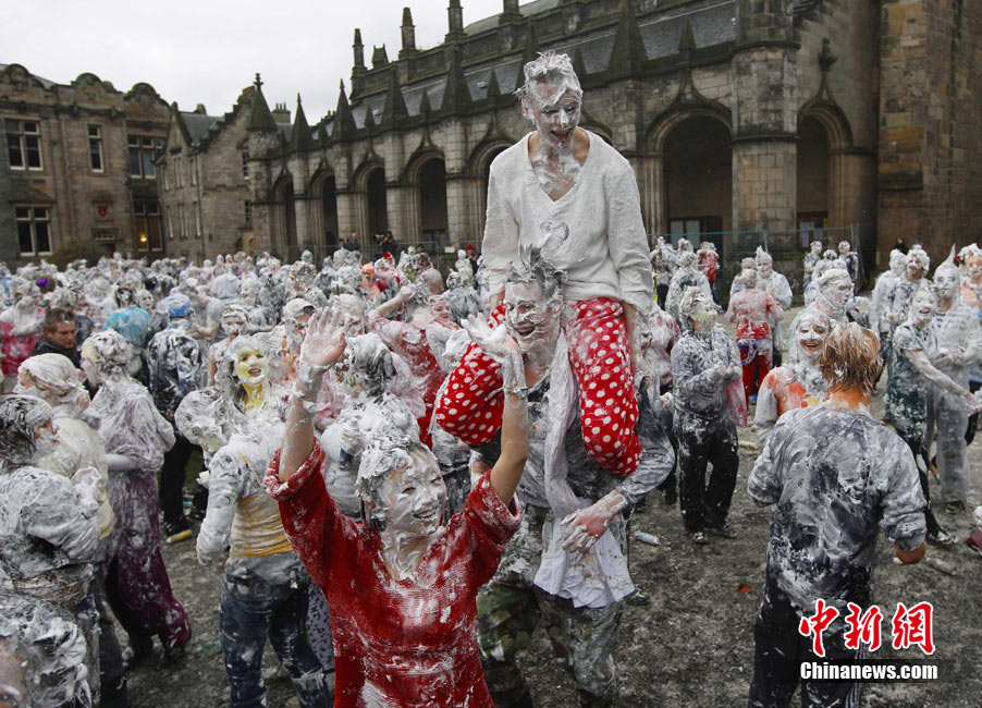 2010年11月22日,在蘇格蘭圣安德魯斯大學(xué)舉行的“周一葡萄干”節(jié)中,大學(xué)生們進(jìn)行了一場(chǎng)別開生面的“泡沫大戰(zhàn)”。