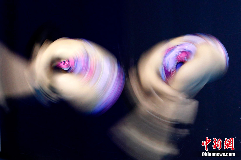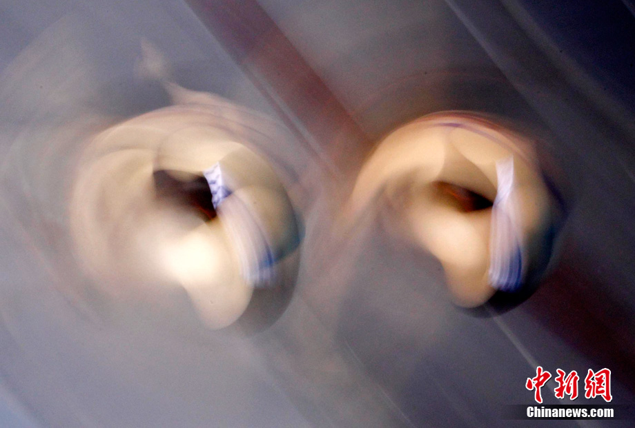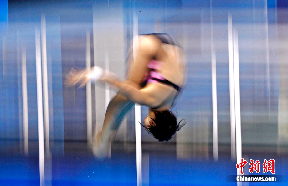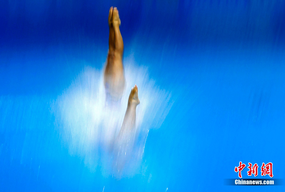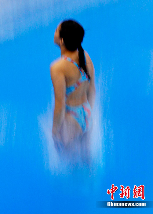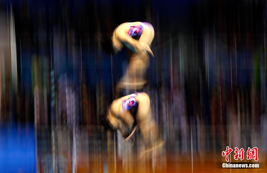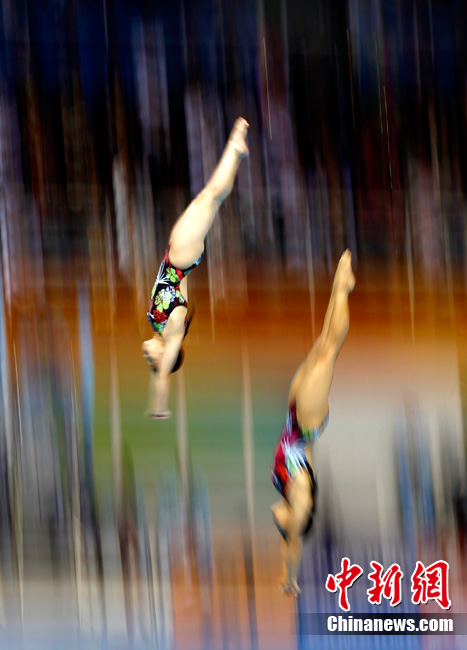 11月23日,廣州亞運(yùn)會(huì)女子雙人10米跳臺(tái)賽場(chǎng)的精彩瞬間。中新社記者 盛佳鵬 攝