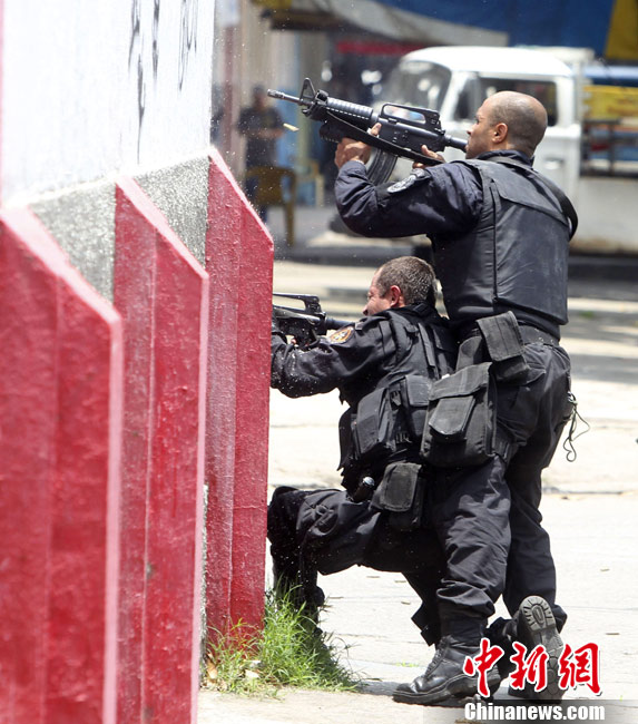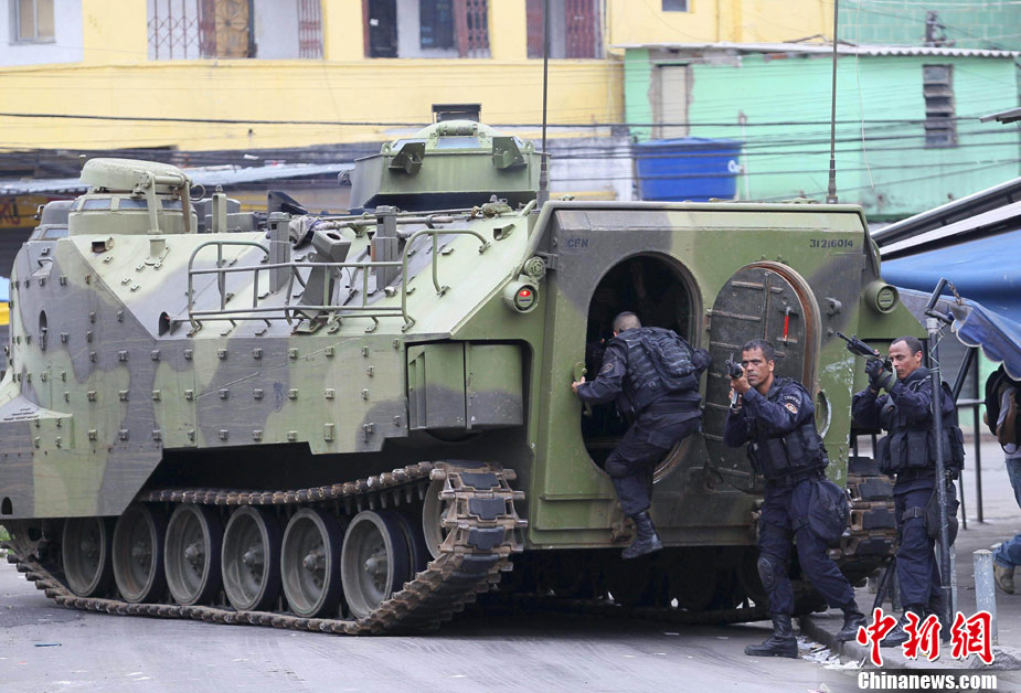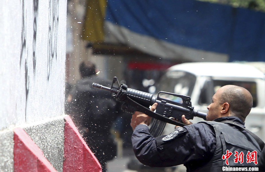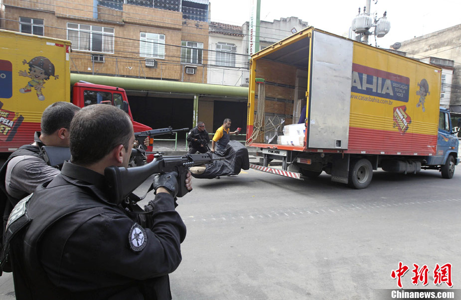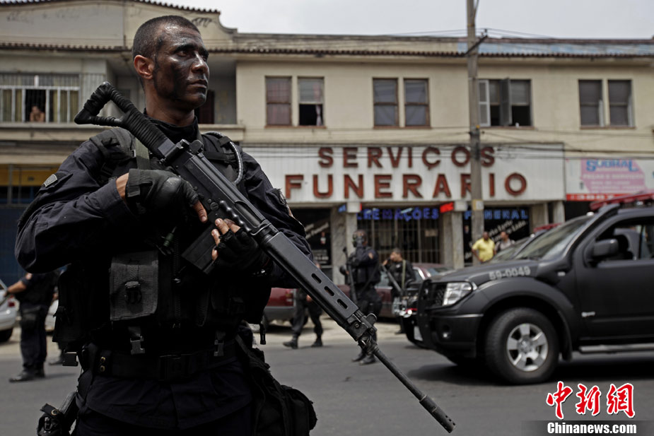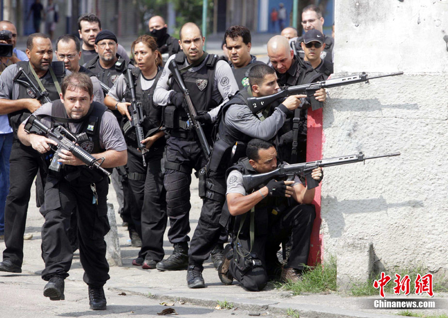 11月24日,巴西里約熱內(nèi)盧發(fā)生激烈槍戰(zhàn)。巴西當(dāng)?shù)氐呢湺炯瘓F(tuán)成員在街頭燒毀轎車和公車,并與警方發(fā)生交火,13名販毒分子被擊斃。