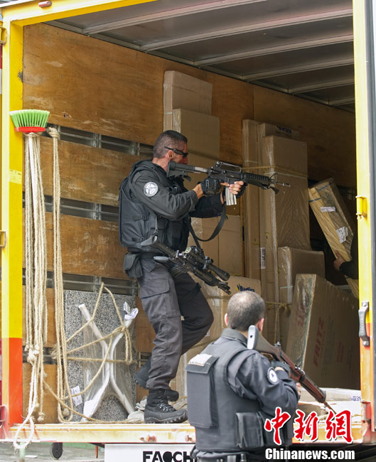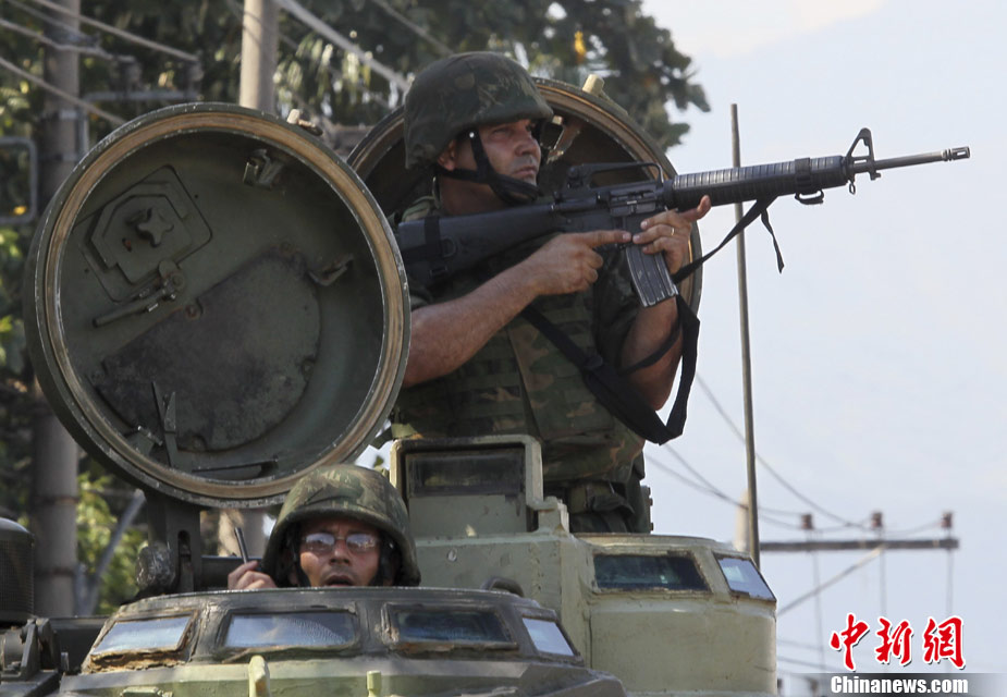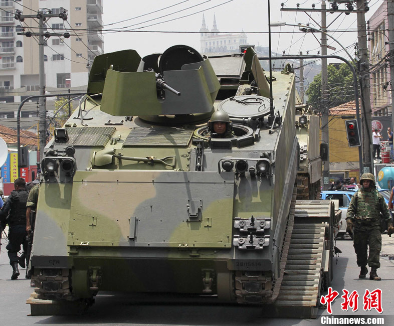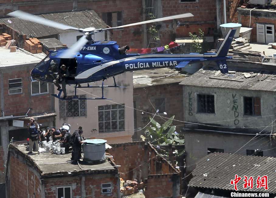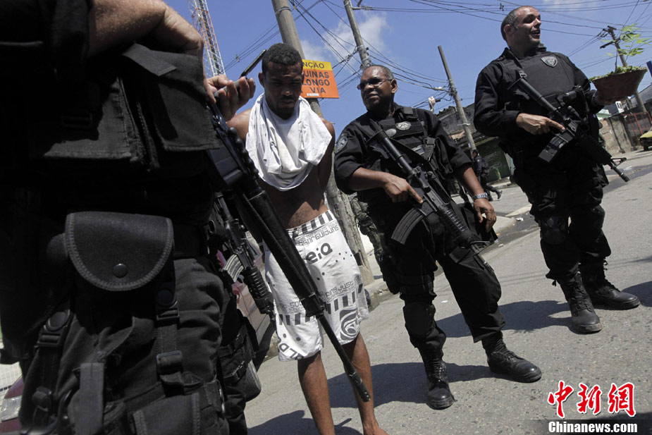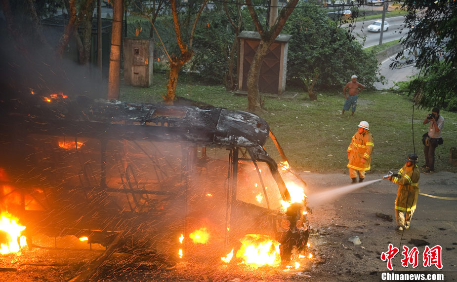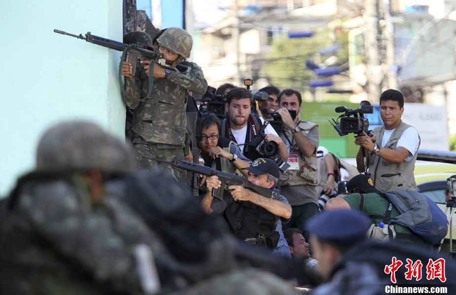 11月24日,巴西里約熱內(nèi)盧發(fā)生激烈槍戰(zhàn)。巴西當(dāng)?shù)氐呢湺炯瘓F(tuán)成員在街頭燒毀轎車和公車,并與警方發(fā)生交火,13名販毒分子被擊斃。