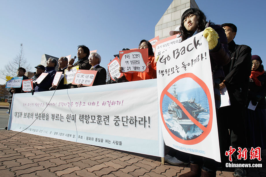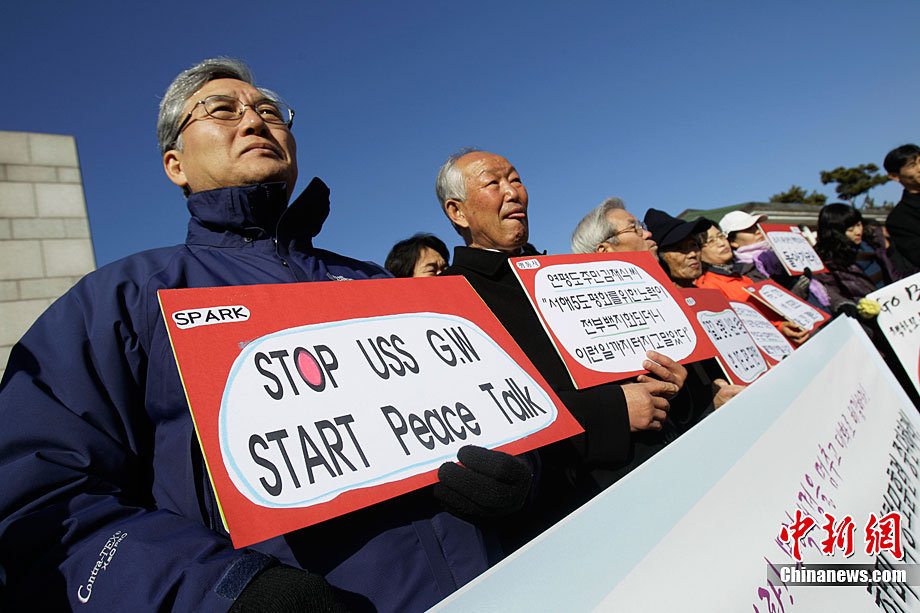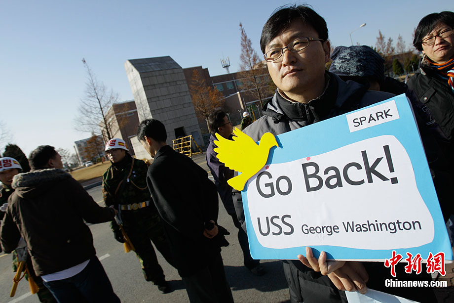 11月28日,韓國民眾在韓國軍事基地前舉行示威游行活動,譴責(zé)美國派遣航母參加美韓聯(lián)合軍演。這些民眾表示反對美國“喬治·華盛頓”號航母進入韓國領(lǐng)土,并與韓國軍方舉行軍事演習(xí)。