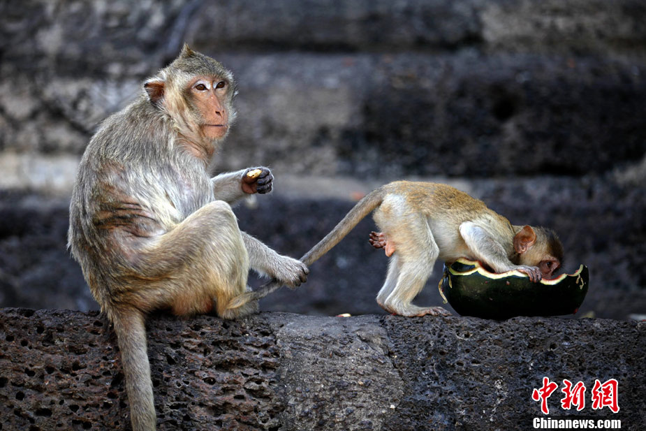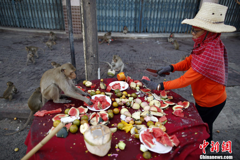 11月28日,泰國華富里,一年一度的“猴子的宴會”活動在當?shù)嘏e行。猴子們可以盡情享用超過4000公斤的水果和蔬菜。華富里以猴子眾多聞名,猴子們每年都為當?shù)匚齺泶罅坑^光客。