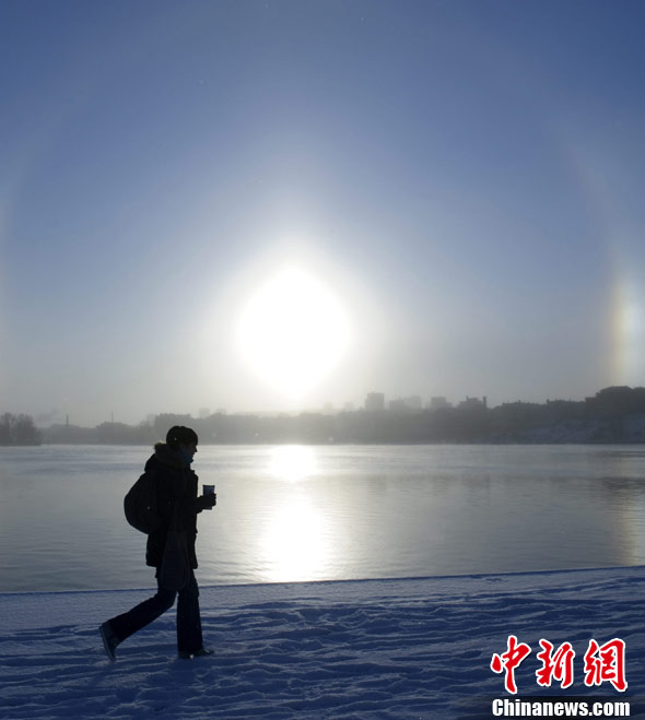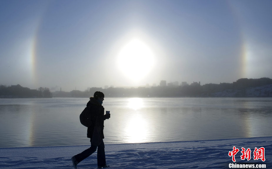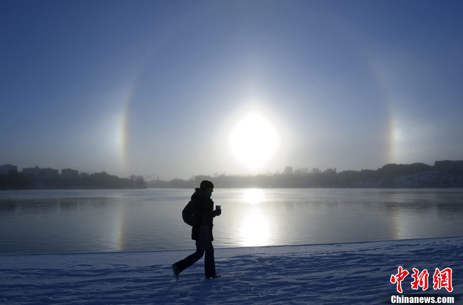 11月30日,瑞典斯德哥爾摩,梅拉倫湖上空出現(xiàn)幻日現(xiàn)象。幻日現(xiàn)象是一種罕見(jiàn)的光暈現(xiàn)象,日光在大氣層中的冰微粒上發(fā)生反射、折射和衍射就可能產(chǎn)生幻日。