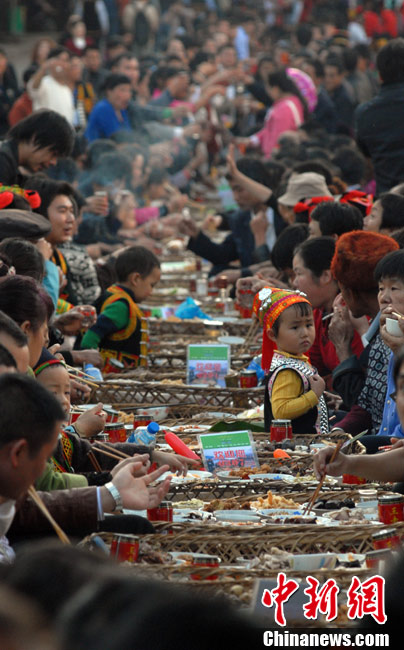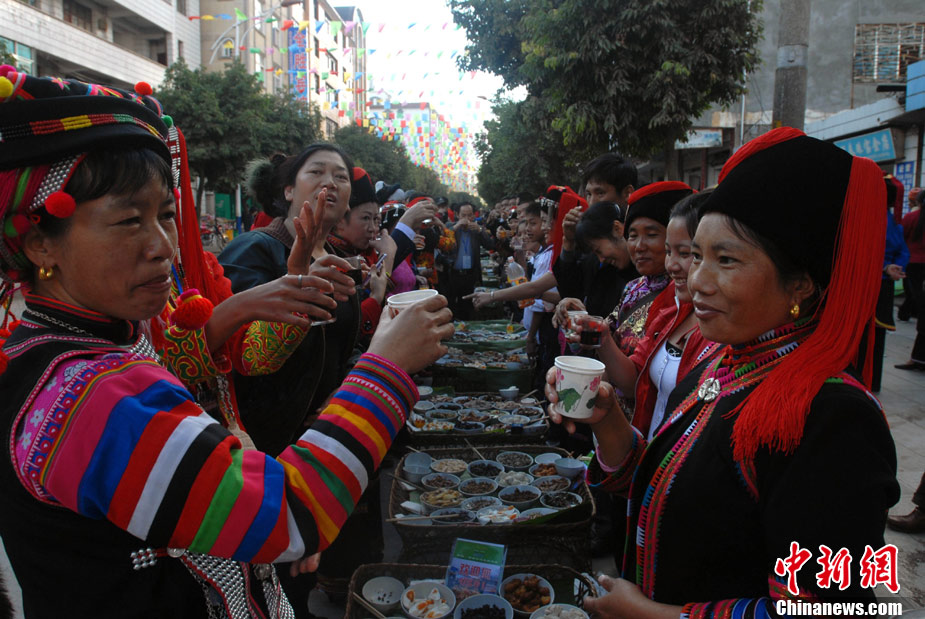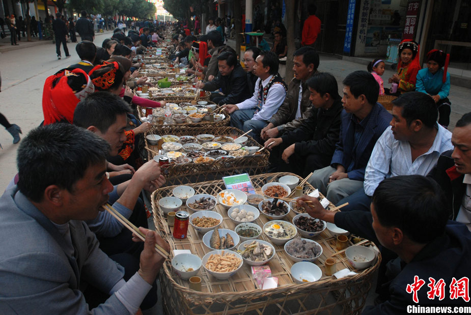 11月30日,有“天下第一宴”、“世界最長(zhǎng)的宴席”美稱的云南綠春哈尼族長(zhǎng)街宴于在云南綠春縣開宴,來自海內(nèi)外上萬(wàn)名游客參加了今年的長(zhǎng)街宴。此次長(zhǎng)街宴共設(shè)1860桌全長(zhǎng)近2000米。云南綠春哈尼長(zhǎng)街宴于2008年以3050桌全長(zhǎng)4000米被上海吉尼斯認(rèn)證為“世界最長(zhǎng)的宴席”。中新社發(fā) 任東 攝