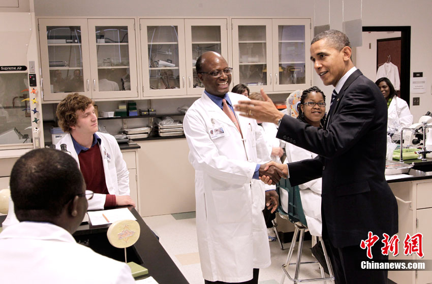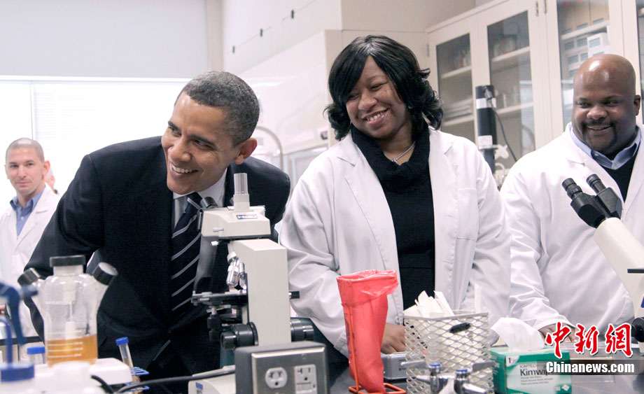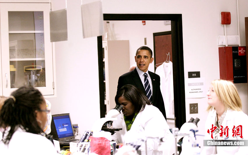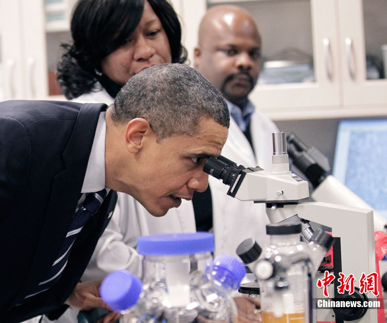 美國總統(tǒng)奧巴馬參觀社區(qū)大學試用顯微鏡