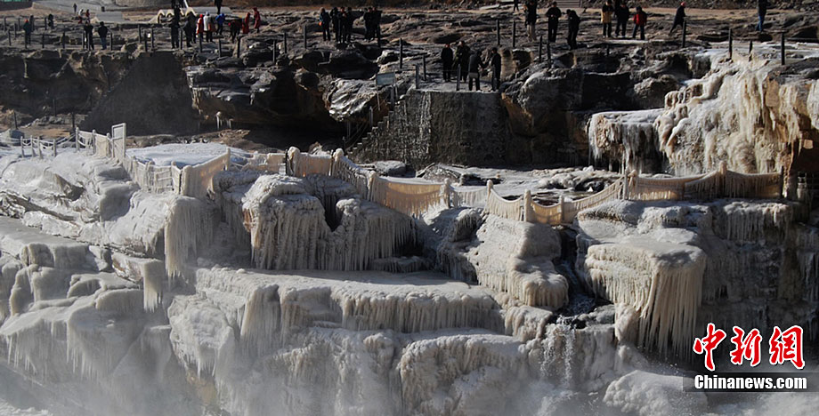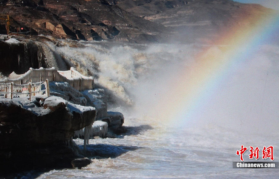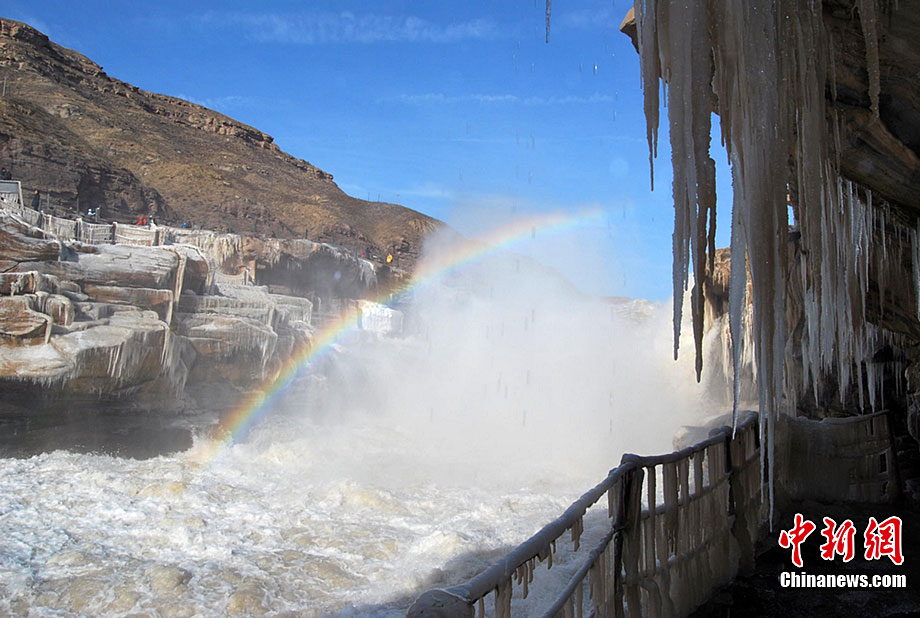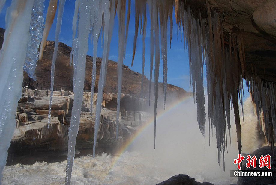 12月15日,受大風(fēng)降溫天氣的影響,黃河壺口段開始大面積流凌。壺口瀑布兩岸的巖石和護(hù)欄上也開始凝結(jié)一排排美麗壯觀的冰掛,晶瑩剔透,造型各異,與瀑布中飛舞的彩虹交相輝映,為冬日的壺口瀑布平添了幾分秀色,讓許多游客流連忘返,頻頻舉起手中的相機(jī)拍照留念。呂桂明 攝 圖片來(lái)源:CNSPHOTO