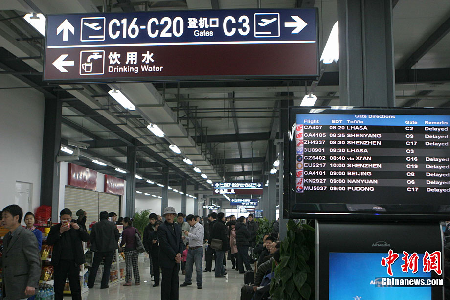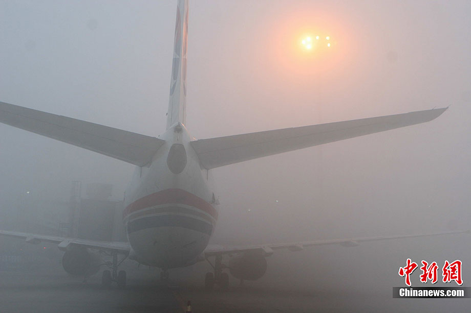 12月28日清晨3時左右,成都雙流國際機場遭遇大霧天氣襲擊。受此影響,機場被迫關閉長達7個多小時。截至11時,大霧造成110個進出港航班延誤,近萬名出行旅客被困機場。中新社發(fā) 呂俊明 攝