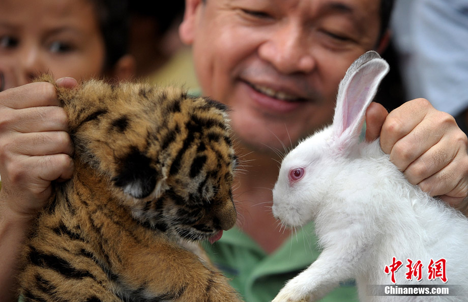 12月28日,菲律賓首都馬尼拉北部的馬拉邦動物園,一名工作人員抓起老虎幼崽和兔子向游客展示。許多亞洲國家都有慶祝農(nóng)歷新年的習(xí)俗,人們即將告別虎年,迎來兔年。