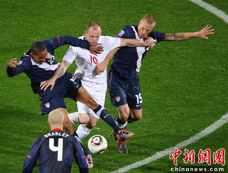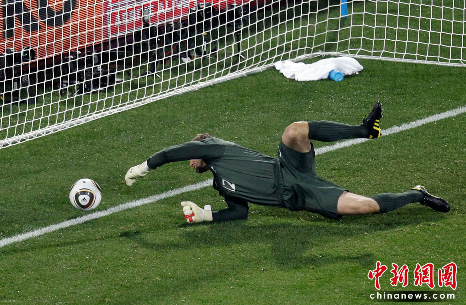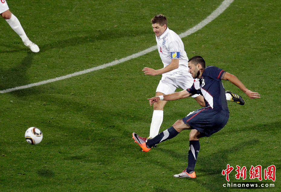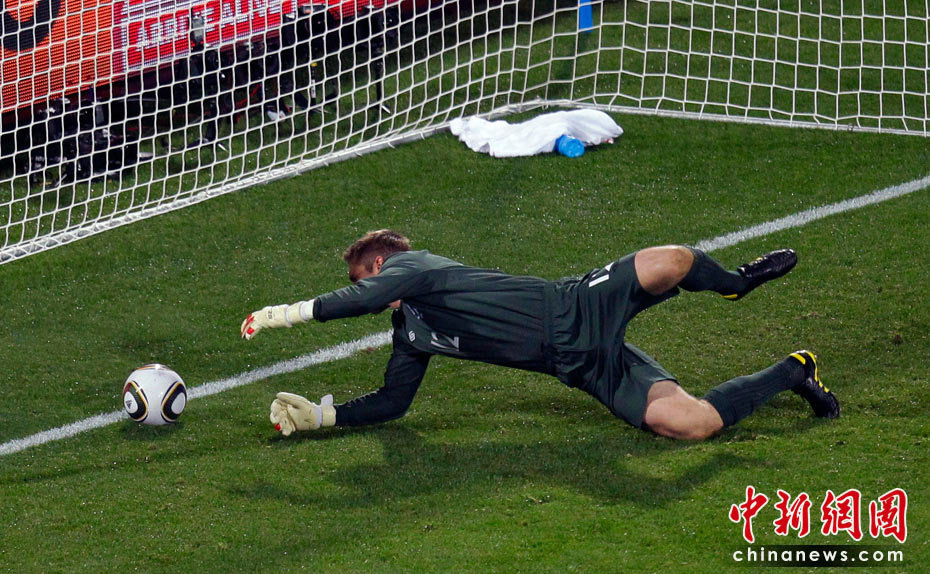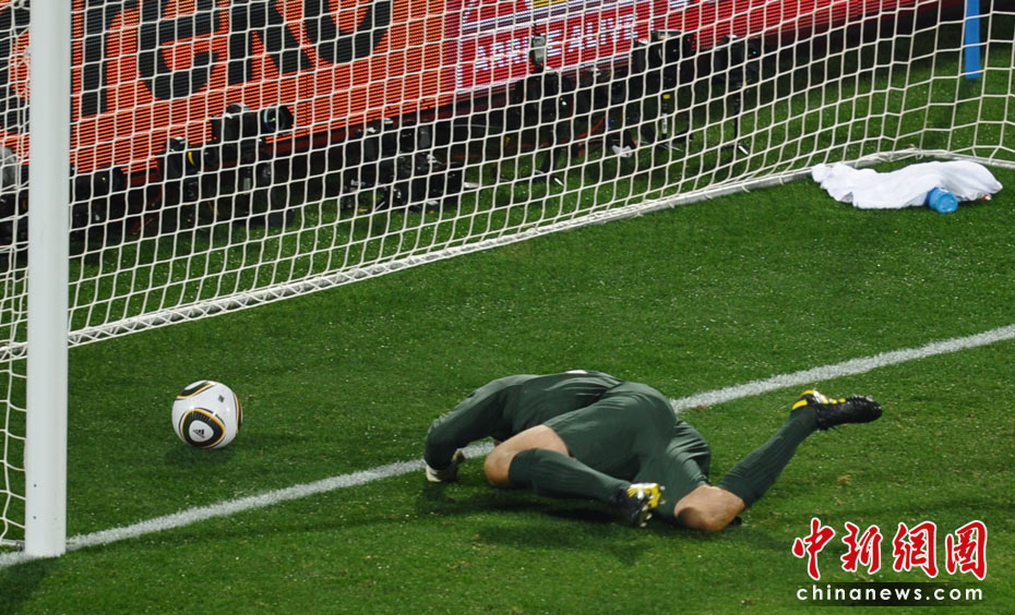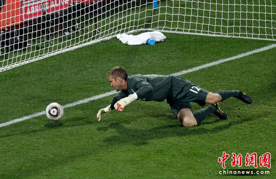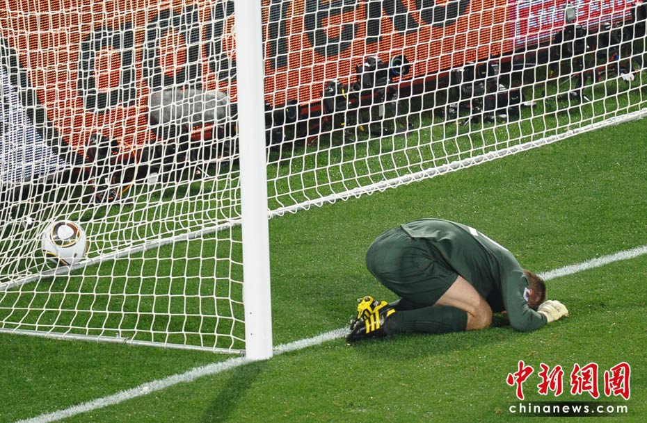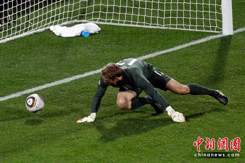 在13日凌晨2:30開始的一場南非世界杯小組賽中,英格蘭隊迎來了首個對手美國隊,雖然蘭帕德在比賽開始后先拔頭籌,但上半場臨近結束前守門員格林的一次超低級失誤斷送好局,最終雙方1-1握手言和。 圖為格林失誤的瞬間。