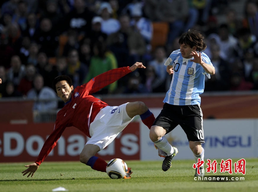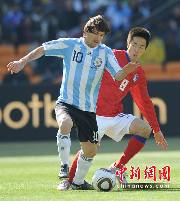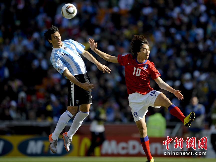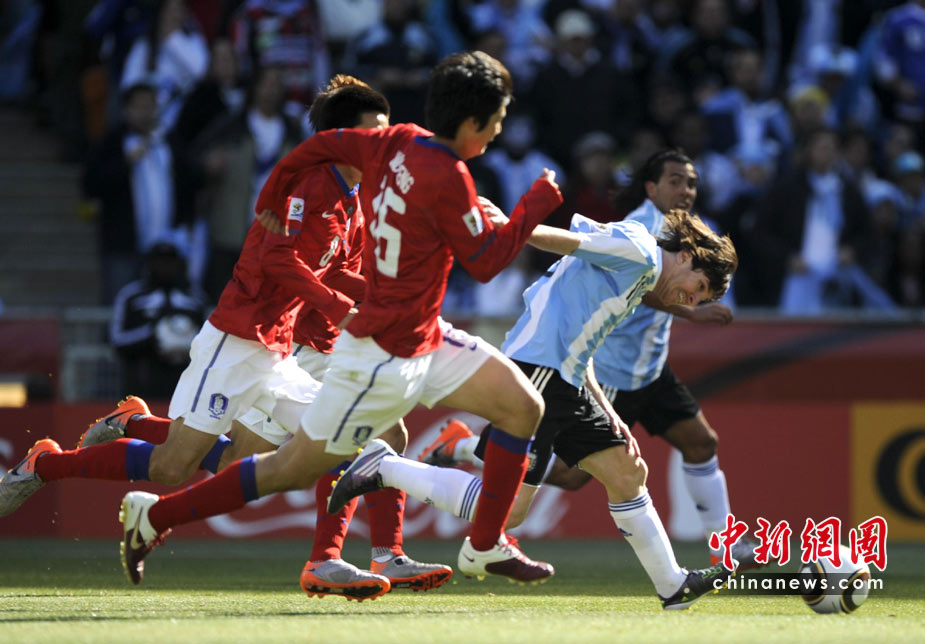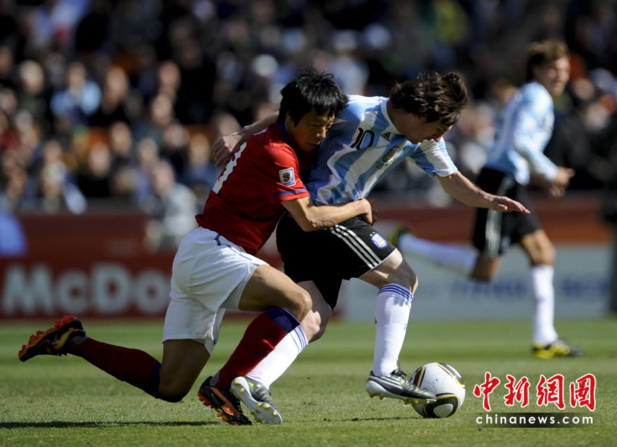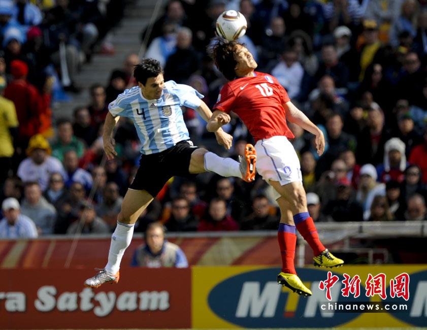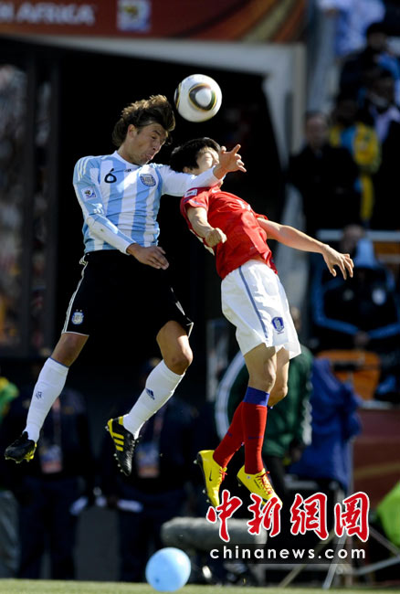北京時(shí)間6月17日19點(diǎn)30分,2010年南非世界杯B組第二輪的首場(chǎng)比賽打響,由兩屆世界杯冠軍得主阿根廷隊(duì)迎戰(zhàn)亞洲“太極虎”韓國(guó)隊(duì)。中新社記者 廖攀 攝