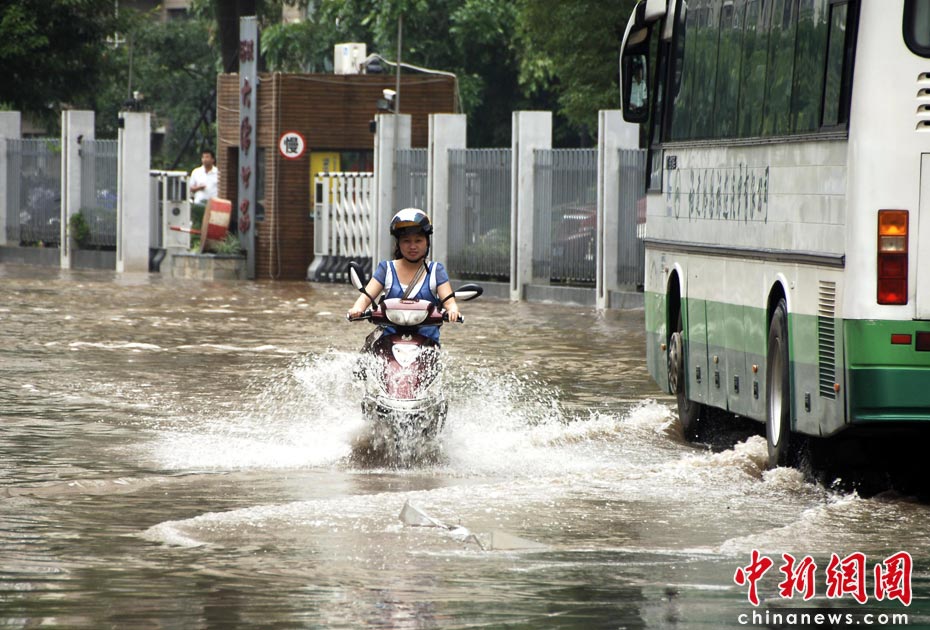 6月19日,福州一市民在市區(qū)被淹的道路艱難騎行。連日暴雨侵襲,福建各地水災(zāi)不斷,已導(dǎo)致165萬人受災(zāi)。中新社發(fā) 王東明 攝