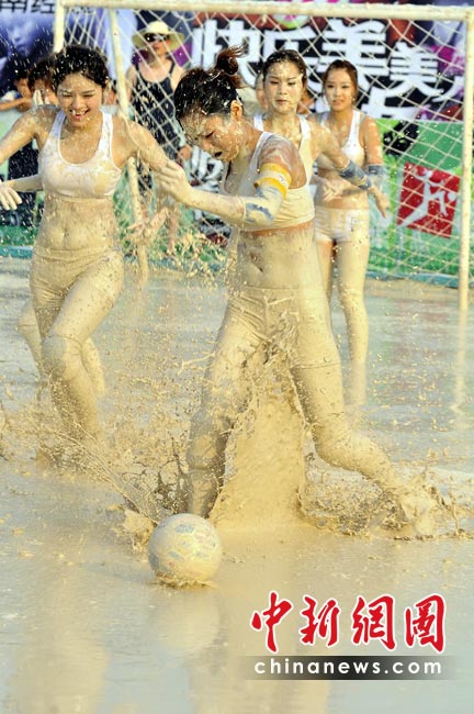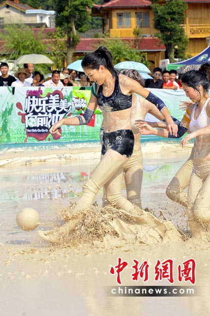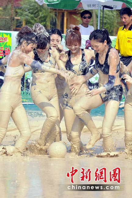 南非世界杯戰(zhàn)火越燃越烈,各地的世界杯熱潮也席卷而來。近日,一檔比基尼美女足球賽在長(zhǎng)沙開鑼,和世界杯男足不同的是,美女們是在泥漿中比賽。據(jù)悉,這檔名為《快樂美美向前沖》的足球賽已在湖南經(jīng)視播出。節(jié)目中,為了順利闖關(guān),眾美女不顧形象,在泥漿中匍匐前進(jìn)和翻滾,引得觀眾爆笑如雷。圖為首場(chǎng)比賽中,湖南隊(duì)美女與湖北隊(duì)美女在連闖四關(guān)后,進(jìn)入泥漿場(chǎng)內(nèi)進(jìn)行終極球賽PK。湖南經(jīng)視供圖