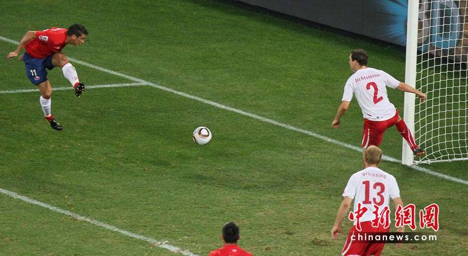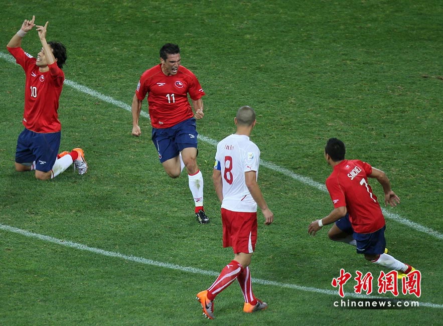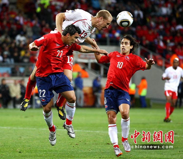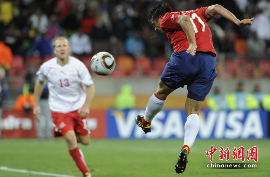 6月21日,世界杯H組第2輪首戰(zhàn)在伊麗莎白港納爾遜-曼德拉灣球場(chǎng)展開較量。瑞士中場(chǎng)貝赫拉米連續(xù)肘擊兩人,被紅牌罰下后,以十人應(yīng)戰(zhàn)的他們?cè)谙掳雸?chǎng)被智利隊(duì)岡薩雷斯打入一球,以0-1告負(fù)。