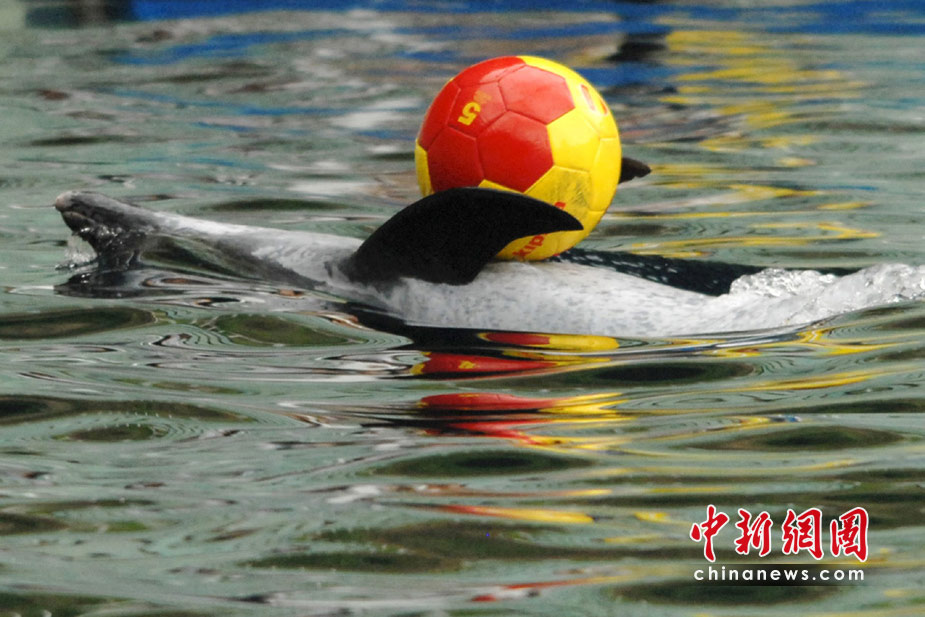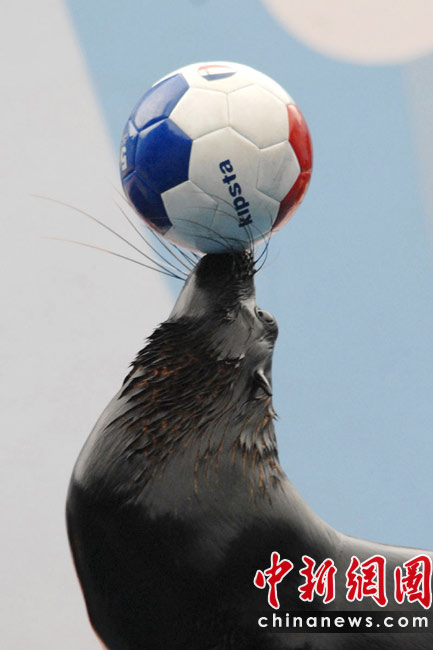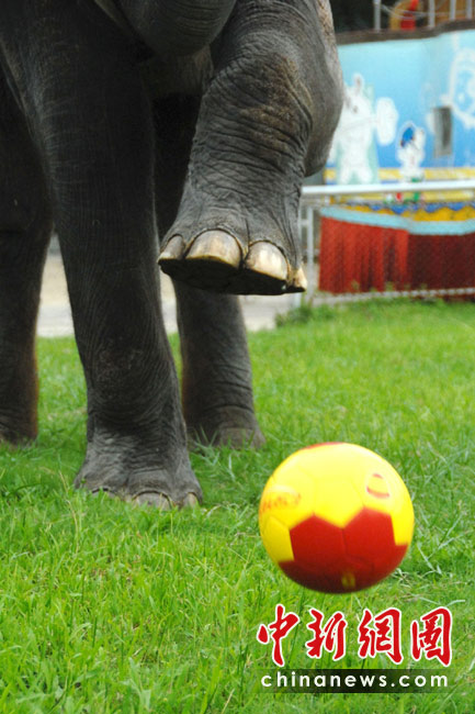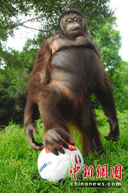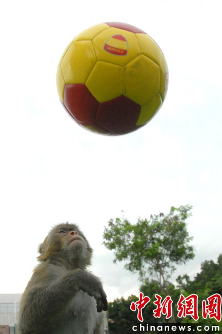 2010年南非世界杯六月底正在如火如荼地進行,人們再次興起一輪熱愛足球的浪潮。居住在深圳野生動物園里的動物們也不甘落后,它們也紛紛玩起足球過把癮。中新社發(fā) 李木生 攝
