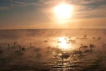 新年伊始,攝影愛好者在青海湖西岸的黑馬河拍到成群大天鵝,冰面散步、水中游弋、展翅飛翔,成為草原冬日里獨特的景致。在冬日晨曦,初升的暖陽下黑馬河水汽升騰,成群的大天鵝宛如仙子沐浴出水,畫面唯美。馬海青 攝