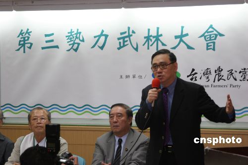 臺灣弱勢政黨十月二十五日在臺北召開“第三勢力武林大會”,呼吁“人民生計(jì)擺中間,政黨惡斗放兩邊”,宏仁集團(tuán)董事長王文洋(右一)在會上發(fā)言時(shí)大聲問到:“全世界都認(rèn)為中國大陸的市場非常重要,我們臺灣為什么不與大陸直航?為什么自己捆手捆腳?”中新社發(fā) 耿軍 攝