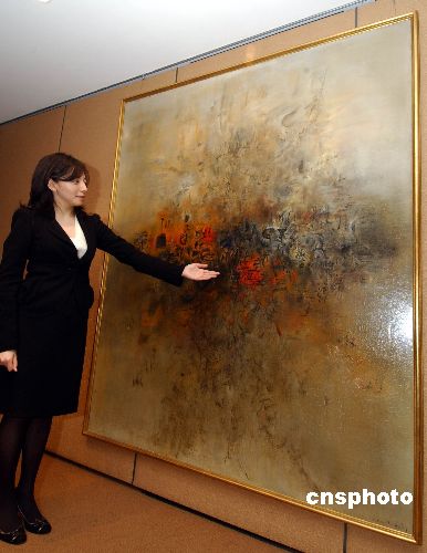 圖為趙無極作品《大地?zé)o形》,運(yùn)用了原始的五種顏色分別隱喻樹木,太陽,大地,及晝夜,巧妙地把文字、形像與構(gòu)圖完全融合一體,估價(jià)2,000萬港元,預(yù)料將打破趙無極作品世界拍賣紀(jì)錄。