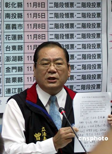 中國(guó)國(guó)民黨立法院黨團(tuán)十一月十四日表示,支持十八個(gè)縣市選舉委員會(huì)的決定,希望明年“立委”選舉與“公投”同日舉行時(shí),采用“二階段領(lǐng)票,二階段投票”方式,讓選舉順暢單純。圖為國(guó)民黨政策會(huì)執(zhí)行長(zhǎng)曾永權(quán)出示全臺(tái)灣二十五個(gè)縣市議會(huì)議長(zhǎng)的共同聲明,他們表示支持這一投票方式。中新社發(fā) 劉舒凌 攝