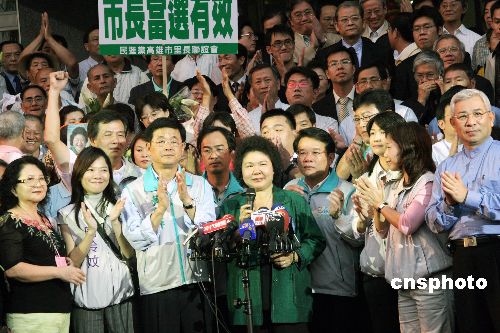 11月16日,高雄市長選舉官司在當(dāng)?shù)囟䦟彾ㄗ。代表中國國民黨的候選人黃俊英在選舉無效和當(dāng)選無效兩項(xiàng)訴訟中均遭判敗訴。民進(jìn)黨的陳菊(前中)在去年12月9日勝出擔(dān)任市長后,今次獲承辦法官支持繼續(xù)擔(dān)任市長。今年6月15日,該官司一審曾判,選舉有效,但陳菊當(dāng)選無效。圖為陳菊在獲知贏得官司后,于高雄市政府前對(duì)支持者允諾未來3年會(huì)以推動(dòng)市民利益的建設(shè)為優(yōu)先。中新社發(fā) 黃少華 攝