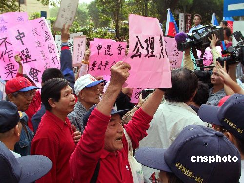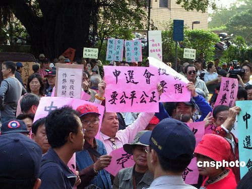 臺(tái)灣“中選會(huì)”委員會(huì)議十一月十六日晚表決確定,明年“立委”選舉合并兩項(xiàng)“公投”舉行,將采“分桌領(lǐng)票、一階段投、圈票方式”進(jìn)行,投錯(cuò)票匭選票屬有效票。圖為當(dāng)天下午臺(tái)灣民眾到“中選會(huì)”所在辦公大樓下表達(dá)訴求,希望選舉能公平公正進(jìn)行。據(jù)了解,在“中選會(huì)”的一項(xiàng)意見調(diào)查中,臺(tái)灣二十五縣市選委會(huì)當(dāng)中的多數(shù)支持“二階段領(lǐng)、投票”模式。中新社發(fā) 劉舒凌 攝