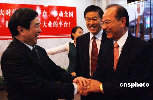 十一月十七日,福建省委常委、常務副省長張昌平(中)、漳州市市長李建國(左)在漳州與中國國民黨副主席林豐正(右)交談甚歡。第九屆海峽兩岸花卉博覽會將于十八日在福建漳州隆重開幕,屆時,島內外五百多名臺商將出席盛會。中新社發(fā) 王東明 攝