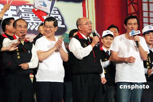 11月24日,中國國民黨在臺灣中部的嘉義市舉行萬人造勢活動,紀(jì)念該黨成立一百一十三周年,也為明年臺灣的兩次重要選舉拉抬聲勢。圖為馬英九、蕭萬長、吳伯雄、王金平等全體與會者高唱《我們都是一家人》、《愛拚才會贏》等歌。整個(gè)造勢活動突出“拚經(jīng)濟(jì)、顧生活”的訴求和“以臺灣為主,對人民有利”的主題。中新社發(fā) 黃少華 攝