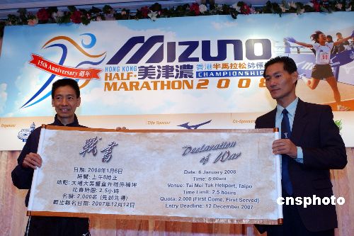 11月30日,香港資深長跑好手李嘉綸(左)代表參賽跑手,從香港田徑總會長跑部主委王劍麟手中接過參賽戰(zhàn)書。香港業(yè)余田徑總會當(dāng)日宣布,一年一度的香港半馬拉松錦標賽將于2008年1月6日舉行。中新社發(fā) 蔡蔓莉 攝