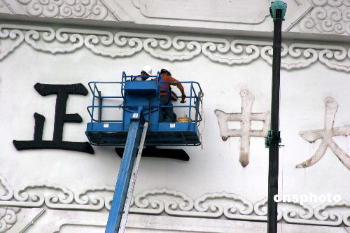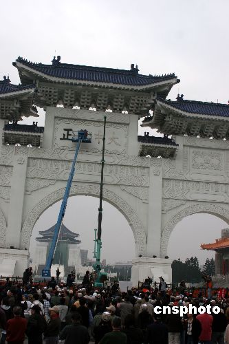 十二月七日,歷時近七個小時的施工,臺北“中正紀念堂”懸掛二十七年的“大中至正”牌匾被拆除。數百名民眾在大門外廣場觀看。中新社發(fā) 董會峰 攝