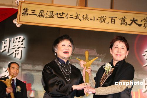 十二月七日,第三屆“溫世仁武俠小說百萬大賞”在臺(tái)北揭曉,年僅二十六歲、在北京工作的趙晨光奪得首獎(jiǎng),并獲得一百萬元新臺(tái)幣獎(jiǎng)金。圖為聯(lián)合報(bào)發(fā)行人王效蘭(中)頒發(fā)首獎(jiǎng),由趙晨光的臺(tái)灣友人代領(lǐng)。中新社發(fā) 董會(huì)峰 攝