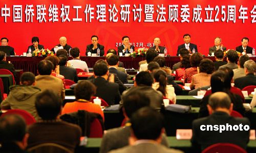 12月8日至9日,中國(guó)僑聯(lián)維權(quán)工作理論研討暨紀(jì)念法顧委成立25周年會(huì)議在北京召開(kāi),會(huì)議表彰了近五年來(lái)各地僑聯(lián)維權(quán)工作先進(jìn)單位和個(gè)人。會(huì)議就建立維權(quán)長(zhǎng)效機(jī)制,切實(shí)維護(hù)歸僑僑眷和海外僑胞在國(guó)內(nèi)的合法權(quán)利和利益進(jìn)行理論研討。中國(guó)僑聯(lián)法顧委是1982年5月6日成立的中國(guó)僑聯(lián)高層法律服務(wù)顧問(wèn)機(jī)構(gòu)。中新社發(fā) 張勤 攝