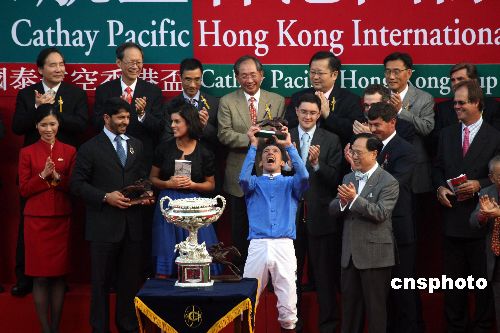 十二月九日,二零零七年國(guó)泰航空國(guó)際賽馬日在香港沙田馬場(chǎng)舉行,四場(chǎng)國(guó)際賽事包括香港杯、香港瓶、香港一哩錦標(biāo)及香港短途錦標(biāo),香港馬在其中兩場(chǎng)奪冠,成績(jī)不俗。特首曾蔭權(quán)出席并向獲得香港杯的選手頒獎(jiǎng)。中新社發(fā) 武仲林 攝