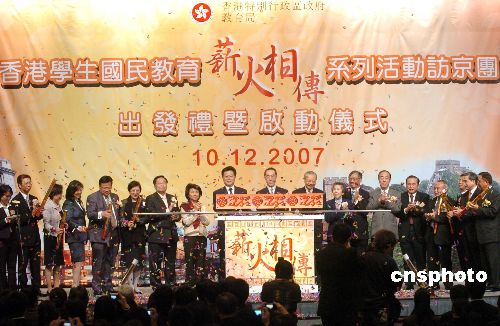 12月10日,香港教育局舉辦的“香港學(xué)生國(guó)民教育薪火相傳系列活動(dòng)訪京團(tuán)”在香港會(huì)展中心舉行出發(fā)典禮﹑授旗及啟動(dòng)儀式。香港政務(wù)司司長(zhǎng)唐英年及中聯(lián)辦副主任李剛及教育局局長(zhǎng)孫明揚(yáng)等為活動(dòng)主持啟動(dòng)儀式。中新社發(fā) 鄧慶樂(lè) 攝
