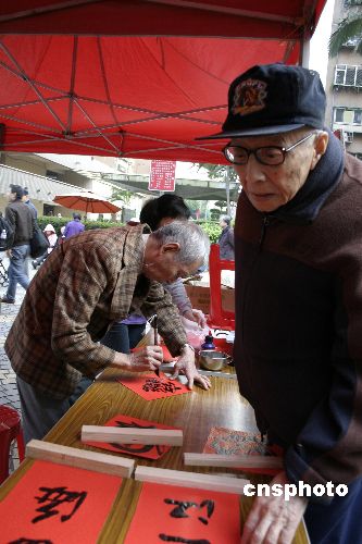 十二月十四日,二00七臺(tái)北眷村文化節(jié)開幕,老人們?cè)诨顒?dòng)現(xiàn)場(chǎng)書寫對(duì)聯(lián)。中新社發(fā) 陳國華 攝