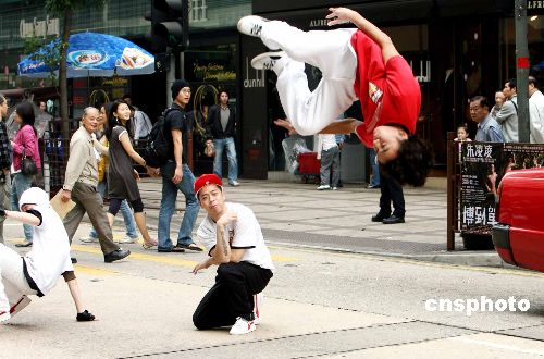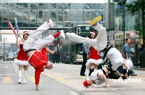 12月18日,香港B-Boys男子跳舞組合在海港城街頭大跳hip hop,靚麗圣誕女郎在場打氣,宣傳倒數(shù)迎接圣誕節(jié)活動。香港海港城將在24日晚舉辦盛大的街頭派對讓市民、游客狂歡倒數(shù)迎接圣誕節(jié)。中新社發(fā) 洪少葵 攝