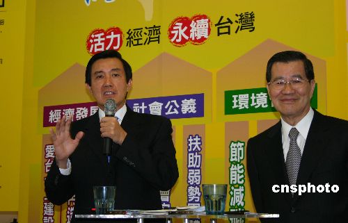 十二月十九日,國民黨二00八參選人馬英九及其搭檔蕭萬長聯合發(fā)布了《臺灣經濟新藍圖之二·產業(yè)再造及全球連結報告》。中新社發(fā) 陳國華 攝