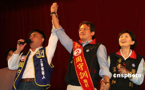 一月十日晚,臺北市市長郝龍斌參加“立委”候選人周守訓(xùn)拉票造勢晚會(huì),為周參選站臺、打氣。臺灣“立委”選舉在即,選戰(zhàn)已進(jìn)入白熱化。中新社發(fā) 孫自法 攝