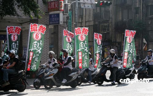 將于一月十二日進(jìn)行的臺(tái)灣第七屆“立委”選舉進(jìn)入最后沖刺階段,十一日,一候選人的摩托車(chē)隊(duì)在臺(tái)北市萬(wàn)華區(qū)掃街拜票,大打“告急牌”。中新社發(fā) 陳立宇 攝