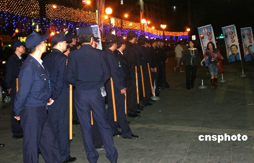 圖為十一日晚警察在候選人造勢的現(xiàn)場附近戒備。中新社發(fā) 陳立宇 攝