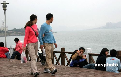 一月二十一日,一對(duì)夫婦從臺(tái)北淡水情人橋上走過(guò),不約而同將視線轉(zhuǎn)向橋邊甜蜜相會(huì)的一對(duì)對(duì)情侶。淡水情人橋位于臺(tái)北淡水河入?诘臐O人碼頭,是觀海、休閑和情侶約會(huì)的好去處。中新社發(fā) 孫自法 攝