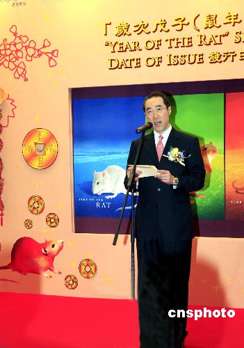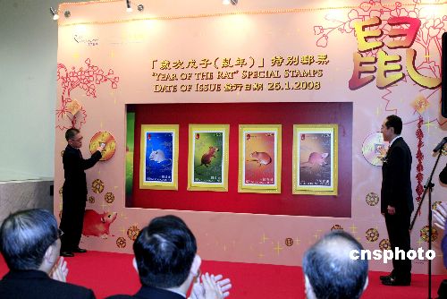 一月二十六日﹐香港郵政舉行農(nóng)歷新年特別郵票“歲次戊子(鼠年)”發(fā)行儀式,特區(qū)政務(wù)司司長(zhǎng)唐英年和香港郵政署長(zhǎng)譚榮邦主禮。唐英年在儀式上致詞,冀香港人學(xué)習(xí)老鼠聰明伶俐、適應(yīng)力強(qiáng)的特質(zhì),把握機(jī)遇,建設(shè)好家園。中新社發(fā) 王麗南 攝