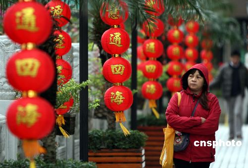 一月三十一日,一位香港市民走過街頭大紅的新春裝飾。當日,香港天文臺表示,今早錄得的最低氣溫為八點五度,是入冬以來的最低紀錄。中新社發(fā) 武仲林 攝