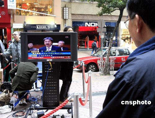 二月二十七日,香港財(cái)政司司長曾俊華向立法會(huì)提交二零零八至零九年度財(cái)政預(yù)算案,公布政府綜合盈余達(dá)一千一百五十六億元,創(chuàng)歷來新高,并推出多項(xiàng)減稅和惠及社會(huì)的措施。當(dāng)?shù)仉娨暸_(tái)街頭直播曾俊華作報(bào)告,并收集市民意見。中新社發(fā) 王麗南 攝