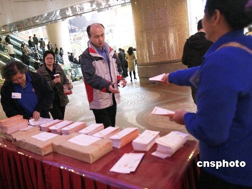 二月二十七日,香港財政司司長曾俊華向立法會提交二零零八至零九年度財政預算案,公布政府綜合盈余達一千一百五十六億元,創(chuàng)歷來新高,并推出多項減稅和惠及社會的措施。圖為有關(guān)組織街頭派發(fā)財政預算案摘要小冊子給市民。中新社發(fā) 王麗南 攝