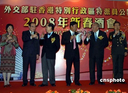 二月二十七日,外交部駐香港特別行政區(qū)特派員公署舉辦新春招待會(huì),行政長(zhǎng)官曾蔭權(quán)(左三)及外交部駐港特派員呂新華(右三)等出席。中新社發(fā) 譚達(dá)明 攝
