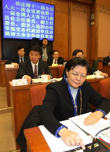3月4日上午,十一屆全國人大一次會議預(yù)備會議選舉產(chǎn)生的大會主席團(tuán),在北京人民大會堂舉行第一次會議,來自香港的全國人大代表范徐麗泰等主席團(tuán)成員表決通過各項議程。中新社發(fā) 任晨鳴 攝