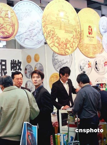3月7日,為期5天的第21屆亞洲國(guó)際郵展在臺(tái)北開(kāi)幕,展出競(jìng)賽類、非競(jìng)賽類及榮譽(yù)類的展品超過(guò)1000框。其中上海版飛雁加印小字郵票,紅印花加字郵票和大龍?jiān)囉∑钡葍r(jià)值新臺(tái)幣上千萬(wàn)元以上的珍稀郵票,最引人注目。圖為一家臺(tái)灣公司設(shè)攤展出北京奧運(yùn)紀(jì)念金銀幣,并在現(xiàn)場(chǎng)向民眾贈(zèng)送北京奧運(yùn)吉祥物福娃宣傳海報(bào)。中新社發(fā) 黃少華 攝