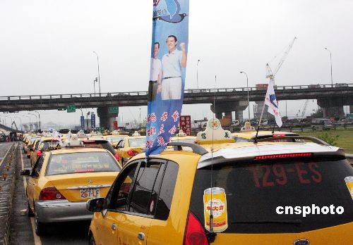 3月10日,一向給外界挺綠印象的臺北全民計(jì)程車聯(lián)誼會決定在此次臺灣大選中棄綠轉(zhuǎn)藍(lán),在總會長邱奕枝號召下,陸續(xù)聚集2500輛計(jì)程車并成立馬蕭后援會,場面壯觀。圖為在集會現(xiàn)場,許多計(jì)程車插上馬蕭競選旗幟,司機(jī)戴上有關(guān)標(biāo)識帽子。中新社發(fā) 黃少華 攝