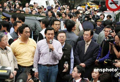 三月二十二日,二00八臺(tái)灣地區(qū)領(lǐng)導(dǎo)人選舉投票。中國國民黨候選人馬英九在臺(tái)北一個(gè)投開票所投票后,接受眾多媒體的采訪。中新社發(fā) 黃少華 攝