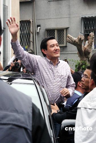 馬英九在臺(tái)北一個(gè)投開票所投票后,離去時(shí)向民眾揮手致意。