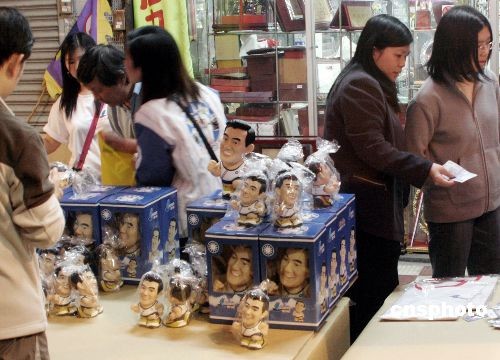 大批支持者在馬蕭競選總部前集會歡慶。圖為集會現(xiàn)場不時有人購買馬英九公仔。